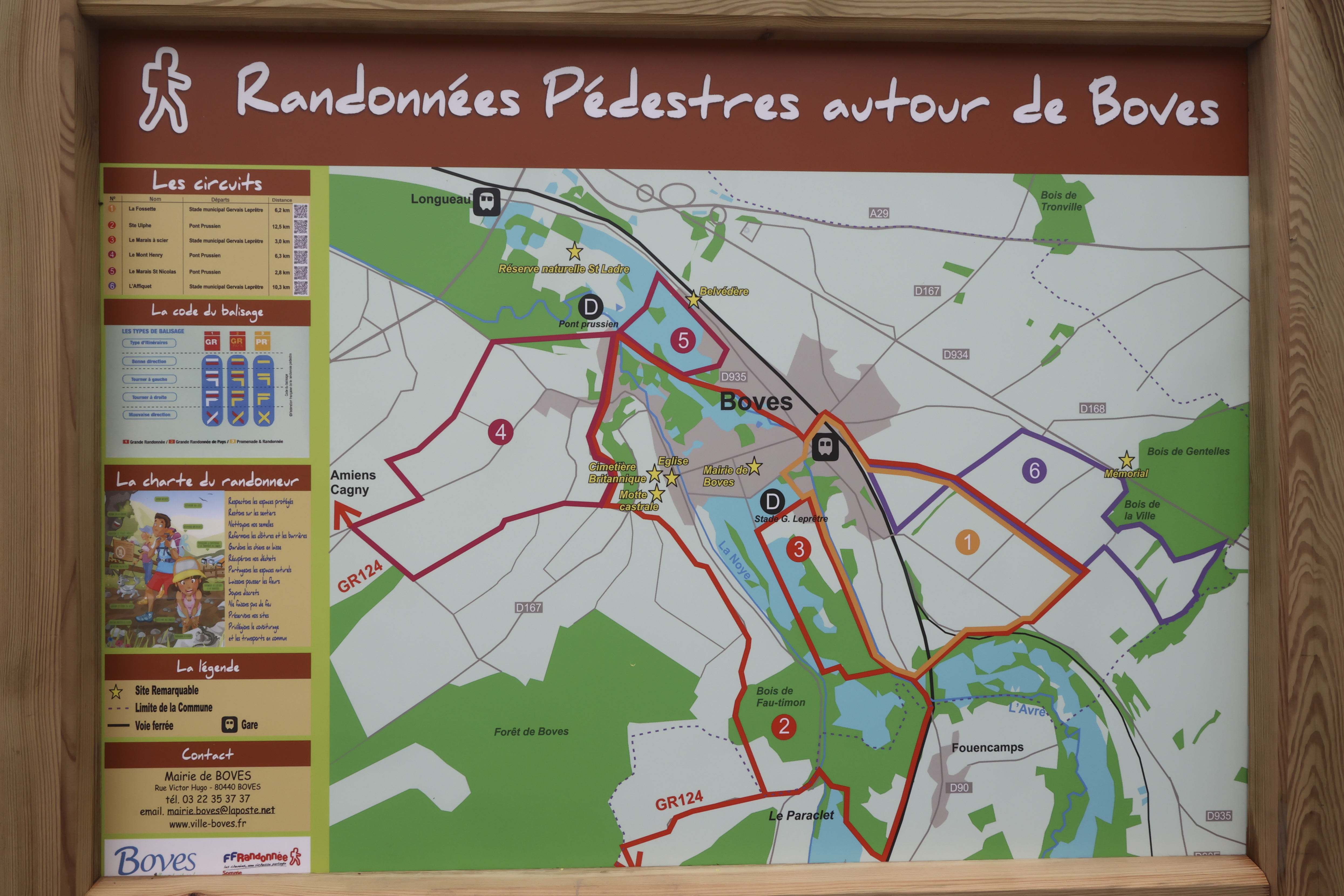 Dans les marais, réserve naturelle Saint-Ladre, le long de l’Avre ou sur les hauteurs où trônent les ruines du château médiéval, « il y en a pour tout le monde, des novices aux sportifs, des adeptes des dénivelés aux marcheurs du dimanche », décrit Maryse Vandepitte, la maire de Boves. L’un de ces parcours se calque partiellement sur le circuit GR (grande randonnée) 124. Un GR dont le tracé a changé en décembre 2023 afin de passer par le centre d’Amiens et la cathédrale Notre-Dame.