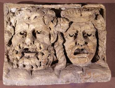 Ce bas-relief provenant sans doute d’une construction importante représente deux masques de scène, l’un d’homme, l’autre de femme, semblant exprimer la douleur (allusion à Janus ?). Une tête d’homme barbu, à la chevelure abondante traitée en mèches auréolant le front et les tempes de boucles découpées, occupe le côté gauche. Le nez est mutilé, la bouche grande ouverte profondément fouillée.