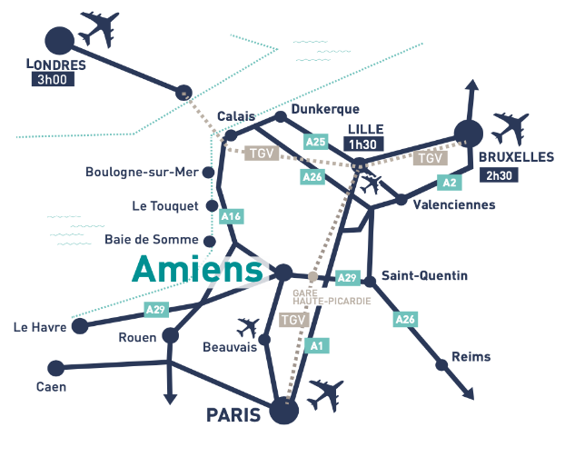 Au cœur d'un bassin de consommation de 80 millions d'habitants, Amiens bénéficie d'une position géographique stratégique à la croisée des autoroutes reliant Paris à Dunkerque (A16) et Londres (via tunnel sous la manche), Paris à Lille et Bruxelles (A1, A2 via A29) mais également Le Havre à Reims (A29) aux autres capitales européennes.